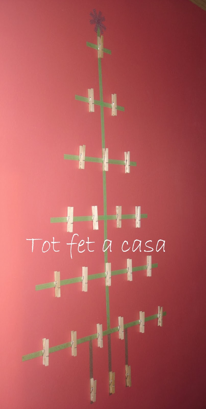 A casa, cada any preparo un Calendari d'Advent diferent per tal de comptar els dies que ens falten per arribar al Nadal. N'he preparat amb gots de plàstic, amb ampolletes de vidre, amb bosses de colors, amb capsetes, amb pots de llauna reciclats, amb calaixets de plàstic, amb tasses... i aquests any amb agulles d'estendre i washi tape.